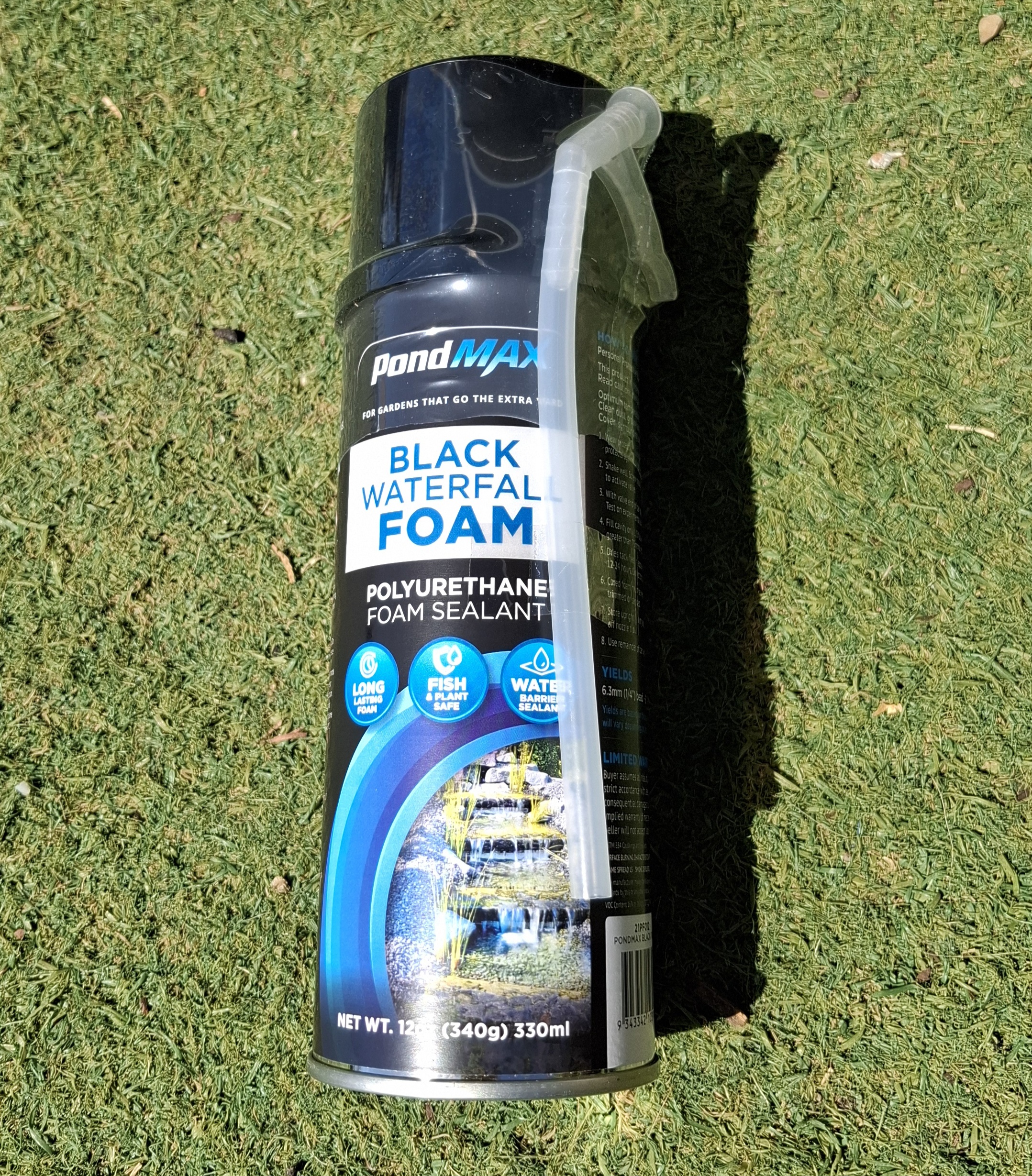 A can of PondMAX Black Waterfall Foam yields 6.3mm (1/4in) bead – 608m (1996ft). Cured foam resists solvents, water and weathering.
